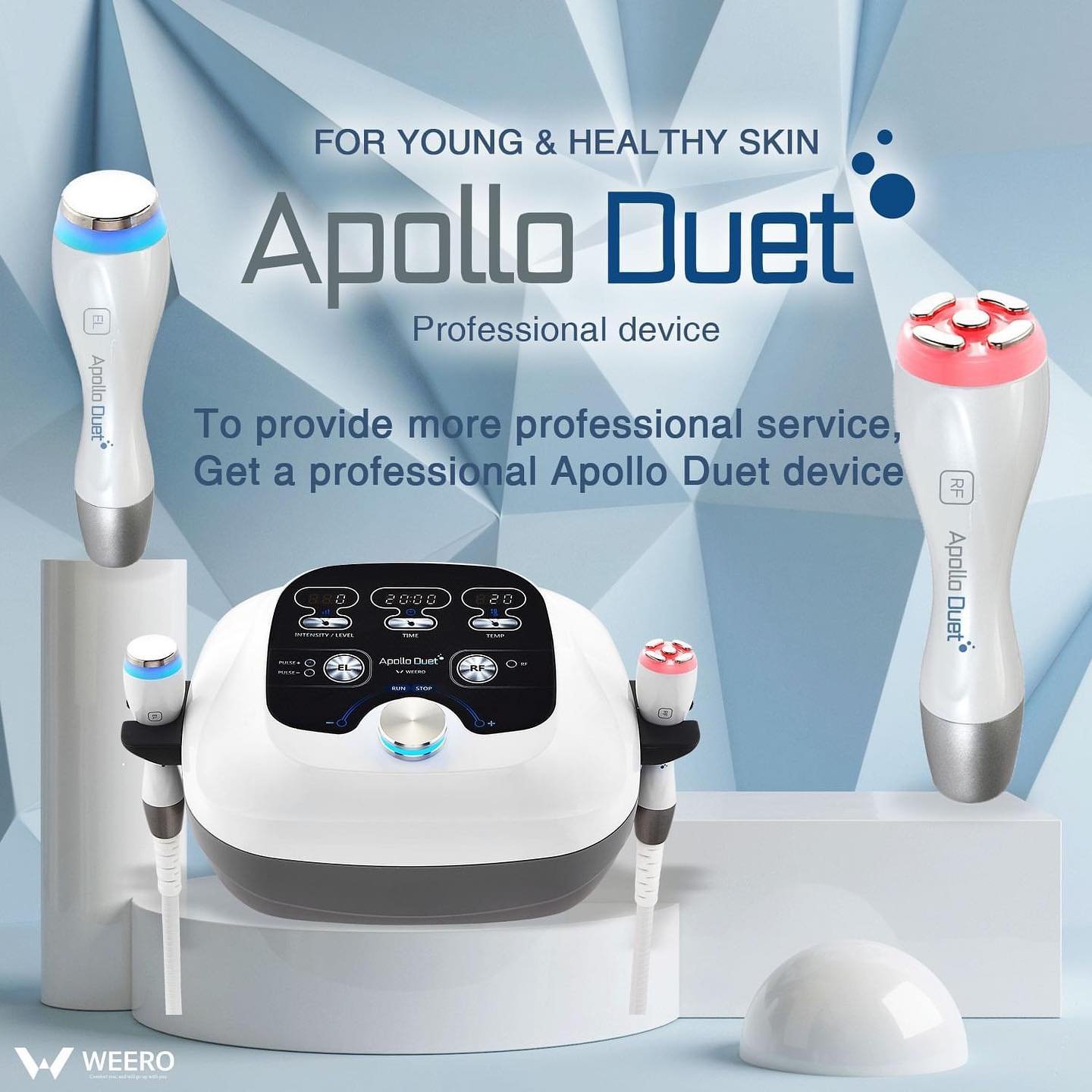 Apollo Duet is a cutting-edge facial skincare system that represents the perfect synergy between Israeli innovation and advanced Korean technology. It combines 5 advanced aesthetic technologies into a single device to treat almost any skin condition with maximum precision.
