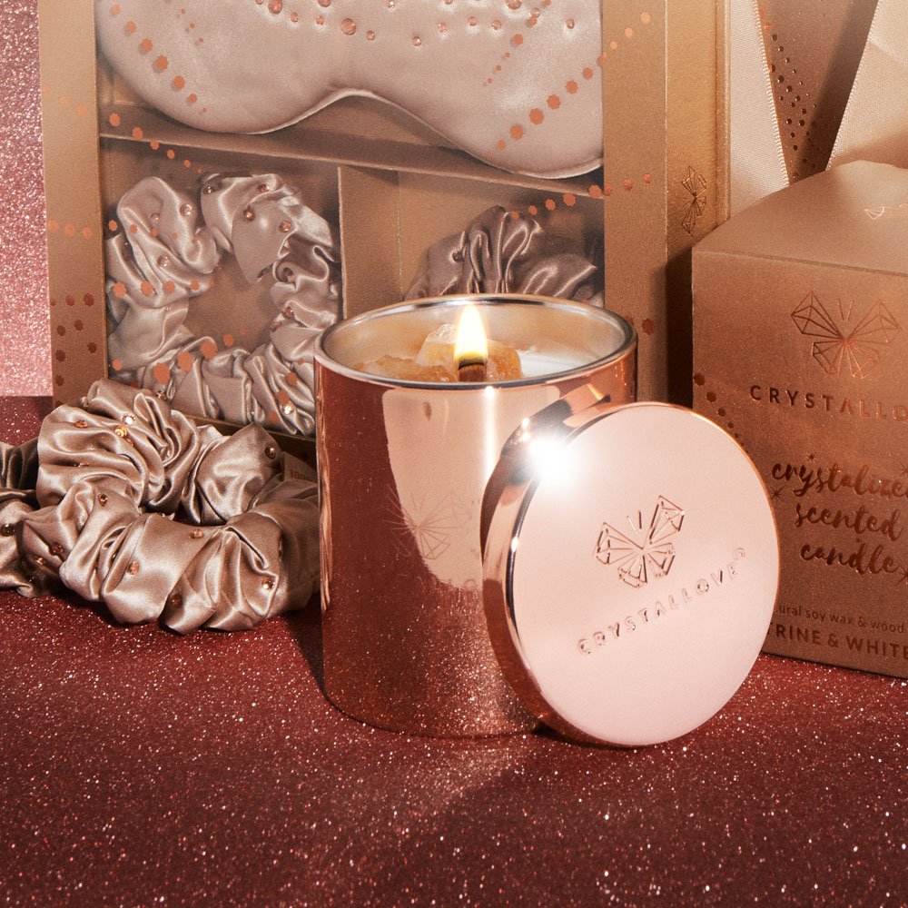 Create wonderful memories and a unique atmosphere with the scented soy candle CRYSTALLOVE CITRINE SOY CANDLE & WHITE TEA imbued with the energy of citrine, considered a stone of wealth and success. A candle full of aromas will fill the space of your home with the relaxing scent of lemon, tea and ginger. Made entirely of natural and biodegradable soy wax, environmentally friendly. The candle has a wooden wick that burns with a unique and charming flame. The luxurious rose gold lid will protect the wax from external impurities. The glass jar is decorated with the brand’s logo. Each CRYSTALLOVE candle is made of the highest quality natural soy wax. Add each citrine nugget to the candle by hand. We pack candles in beautiful boxes, which have already become the showcase of the CRYSTALLOVE brand. They will be perfect as a gift.