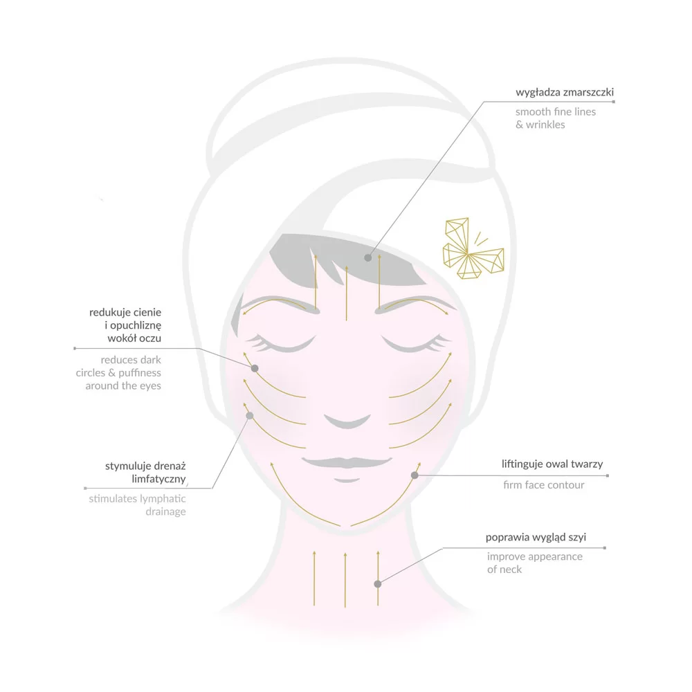 Gua sha facial massage stimulates lymphatic drainage, helping cleanse the skin of toxins, and relieves facial muscle tension. Wrinkles and fine lines are reduced. The plate, enriched with notched edges in two different sizes (smaller and larger teeth), gives an immediate massage effect, reduces wrinkles and fine lines while lifting and firming the skin. The notched edge additionally stimulates energy points, unblocking lymphatic stagnation, which leads to, among others, skin problems. By removing blockages, the skin quickly becomes nourished and radiant. Additionally, the natural coolness of the stone reduces swelling and dark circles under the eyes, the skin becomes fresher and its elasticity improves.