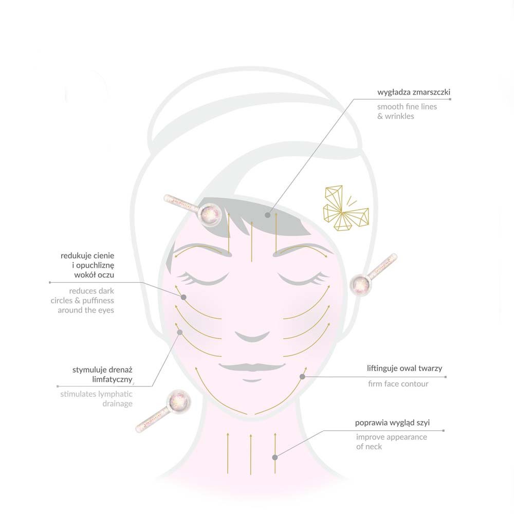 Face massage with Cryolift ice globes glass balls is performed on cleansed skin covered with your favourite oil, serum or sheet mask, making movements from the inside to the outside of the face. Face massage is performed according to the instructions included in the package.